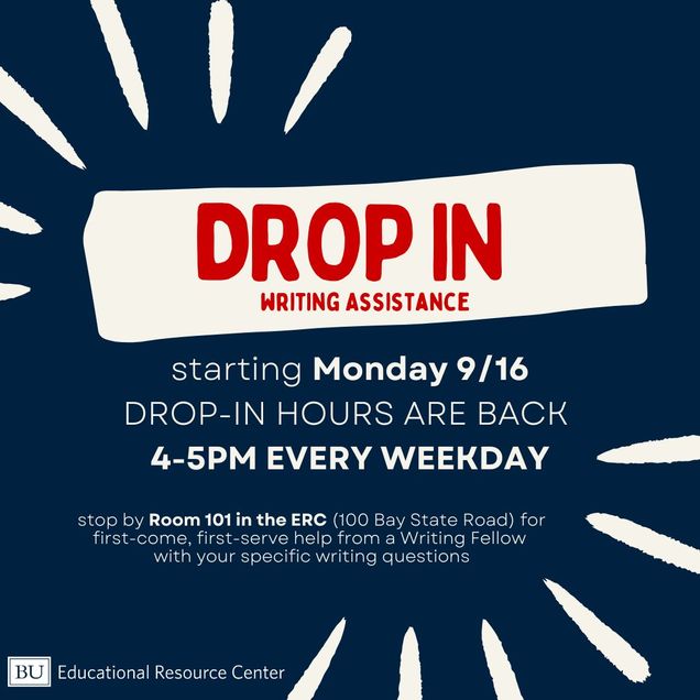 Want help with reviewing your thesis, paraphrasing a quote, or coming up with ideas for your paper? Those who have specific writing questions can drop by Room 101 in the ERC from 4-5PM every weekday to talk with a Writing Fellow. Drop-in sessions are on a first-come, first-serve basis.